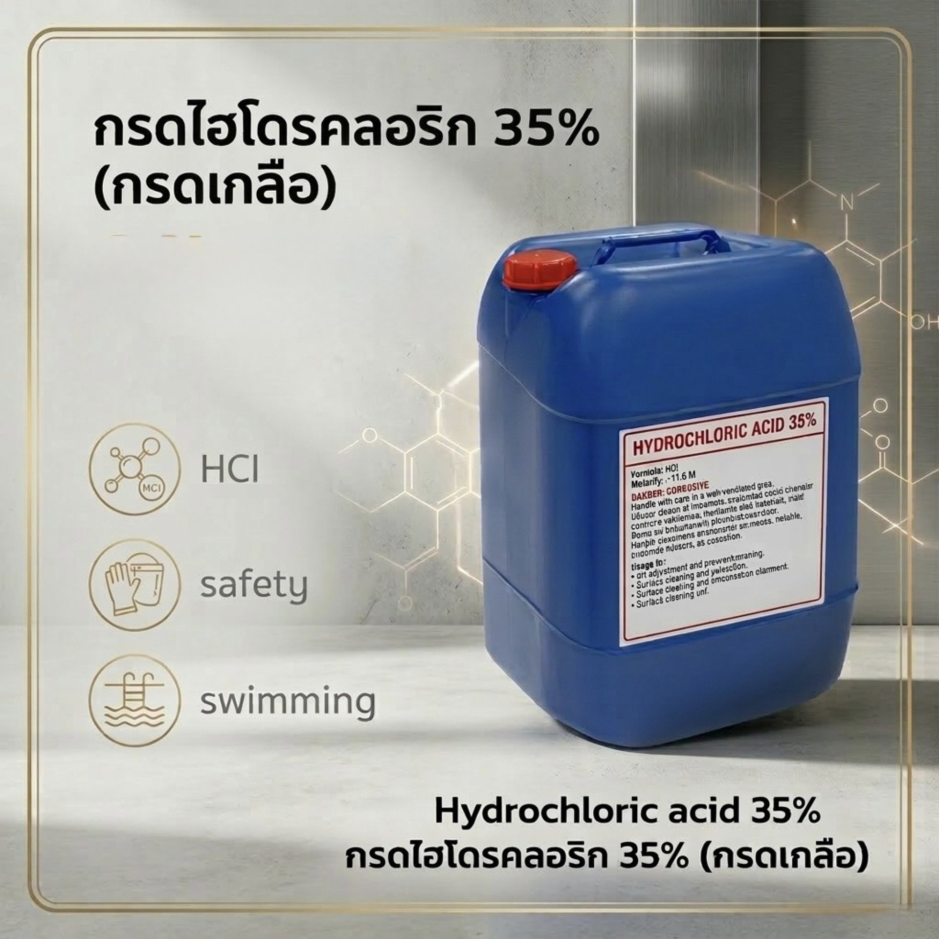 กรดเกลือ 35% หรือที่เรียกว่า กรดไฮโดรคลอริก (Hydrochloric Acid) เป็นสารเคมีที่นิยมใช้ในงานทำความสะอาด งานอุตสาหกรรม และงานดูแลสระว่ายน้ำ โดยมีคุณสมบัติเป็นกรดเข้มข้น สามารถช่วยลดค่า pH ของน้ำ และกำจัดคราบตะกรันหรือคราบหินปูนได้อย่างมีประสิทธิภาพ