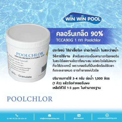 T.C.C.A 90% Chlorine Powder Packing 1 kg. , ใส่ในสระว่ายน้ำ 4 กรัม ต่อน้ำ 1 คิว แล้ววัดปริมาณ ให้ได้มาตรฐาน 1-3PPM (Update 01/04/2025)