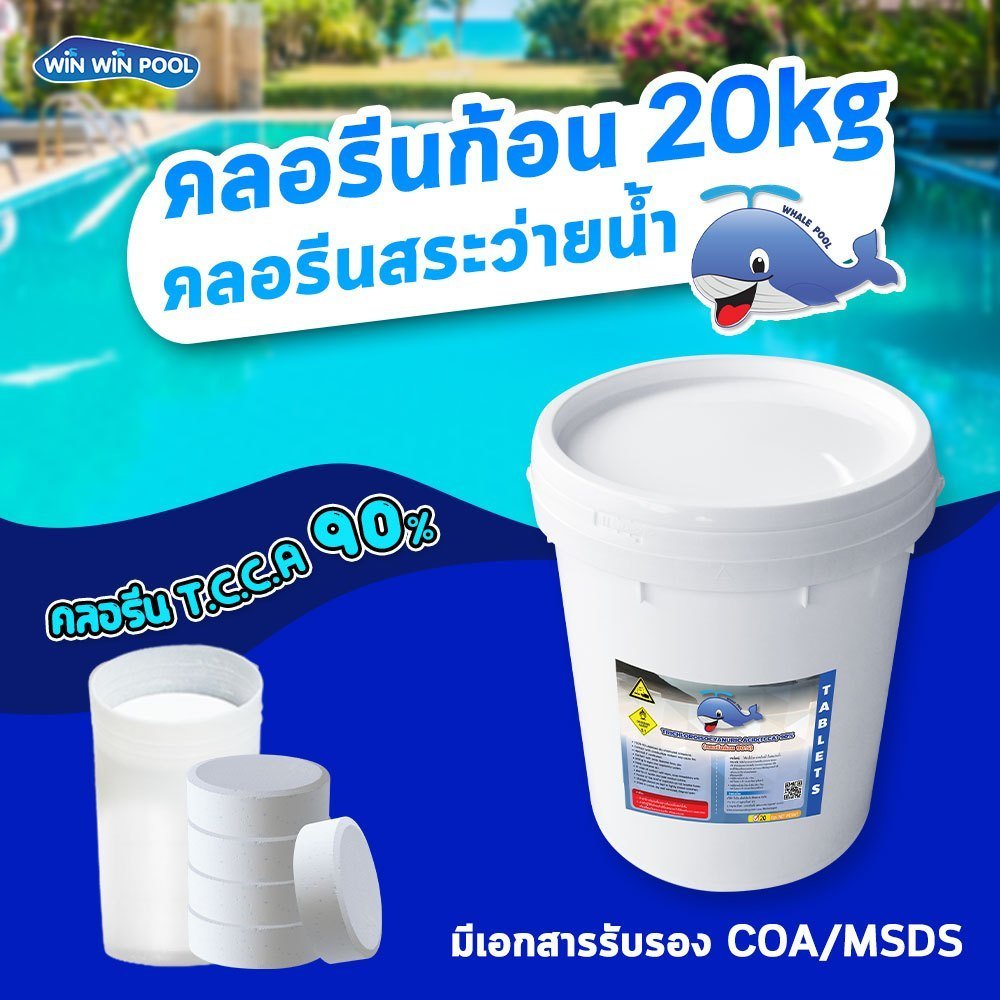 - เพื่อบำบัดน้ำเขียว ขุ่น ในสภาพไม่ปกติ ใช้ปริมาณ 1 ก้อน (200 กรัม) ต่อน้ำ 10 คิว (10,000 ลิตร) ทุกๆ สัปดาห์ แล้วตรวจวัดปริมาณคลอรีนในช่วงเช้า ให้ได้มาตรฐานระหว่าง 1-3 PPM