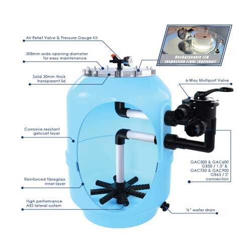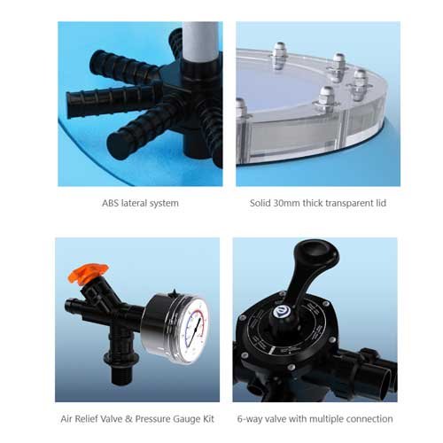 กรองแบบกว้างโปร่งใสให้ขนาดพิเศษในการตรวจสอบและรักษาสภาพตัว กรองที่ดีที่สุด ด้วยวาลัว 6 ทิศทาจ Emaux ที่เชื่อถือได้และทนทาน ตัวกรองแบบลามิเนตนี้จึงเป็นหนึ่งในตัวกรองกรายที่ซับซ้อนที่สุดในตลาด