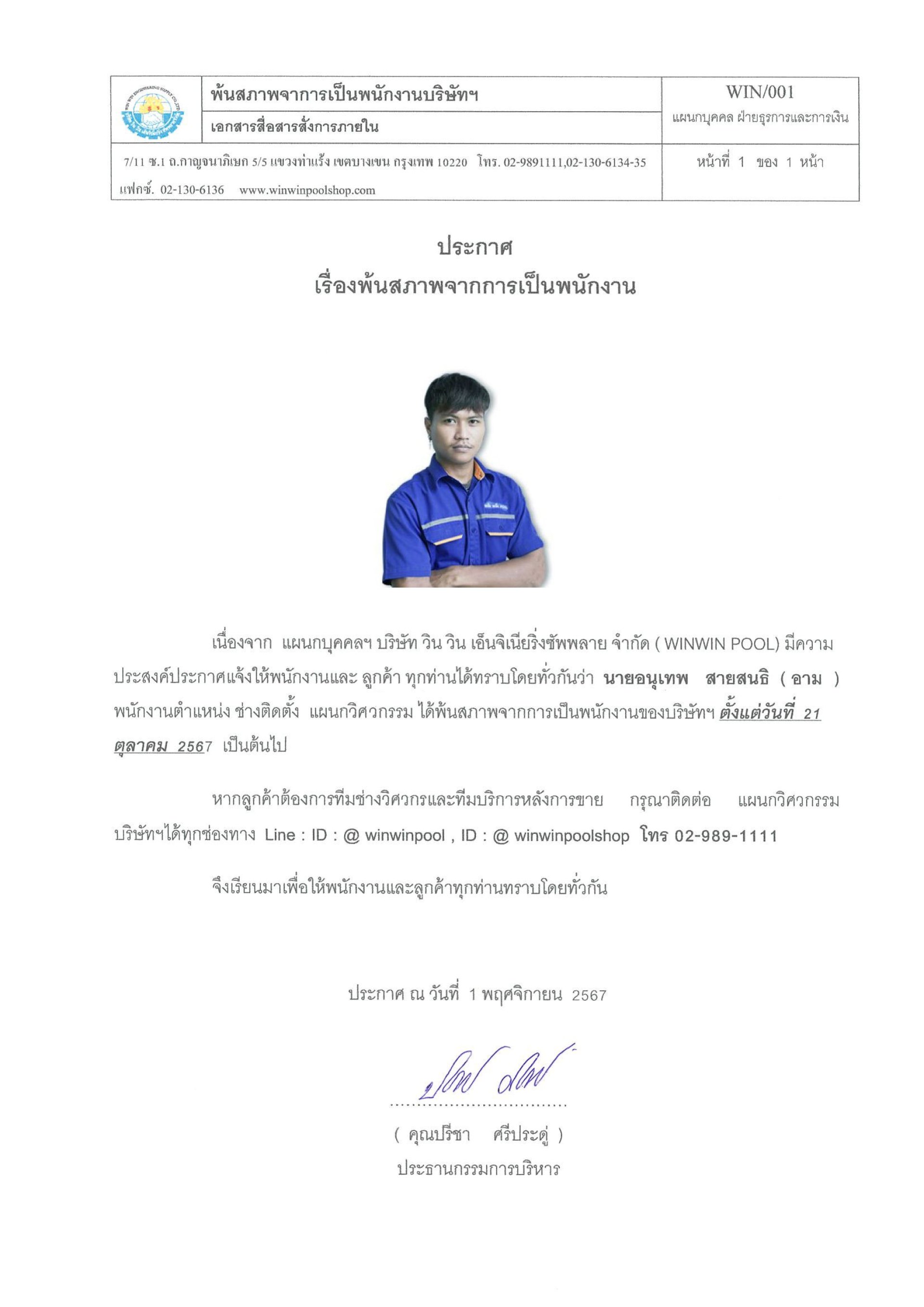 เรื่อง พ้นสภาพการเป็นพนักงาน นายอนุเทพ สายสนธิ ( อาม ) พนักงานตำแหน่ง ช่างติดตั้ง แผนกวิศวกรรม
