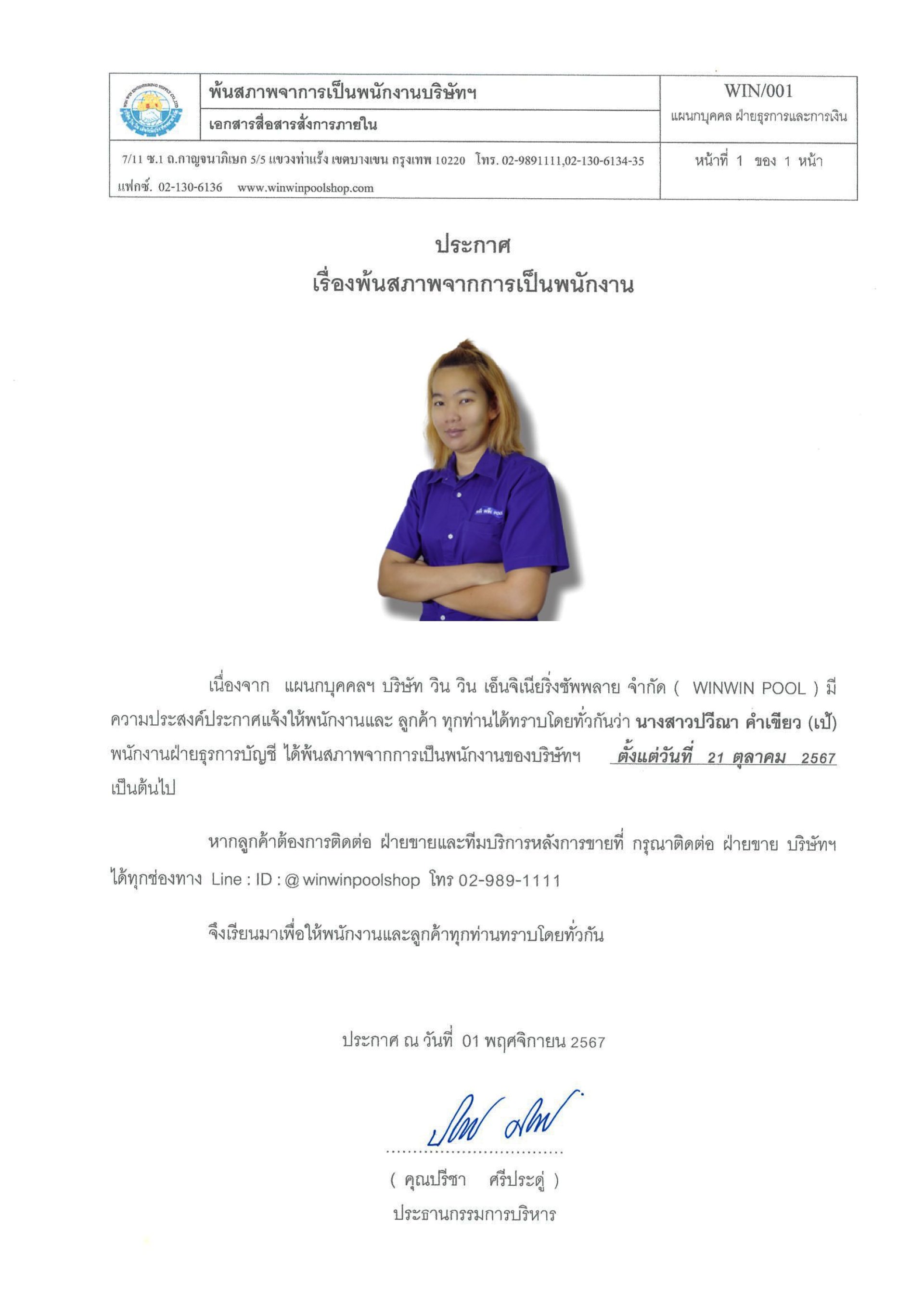 เรื่อง พ้นสภาพการเป็นพนักงาน นางสาวปวีณา คำเขียว (เป้) พนักงานฝ่ายธุรการบัญชี