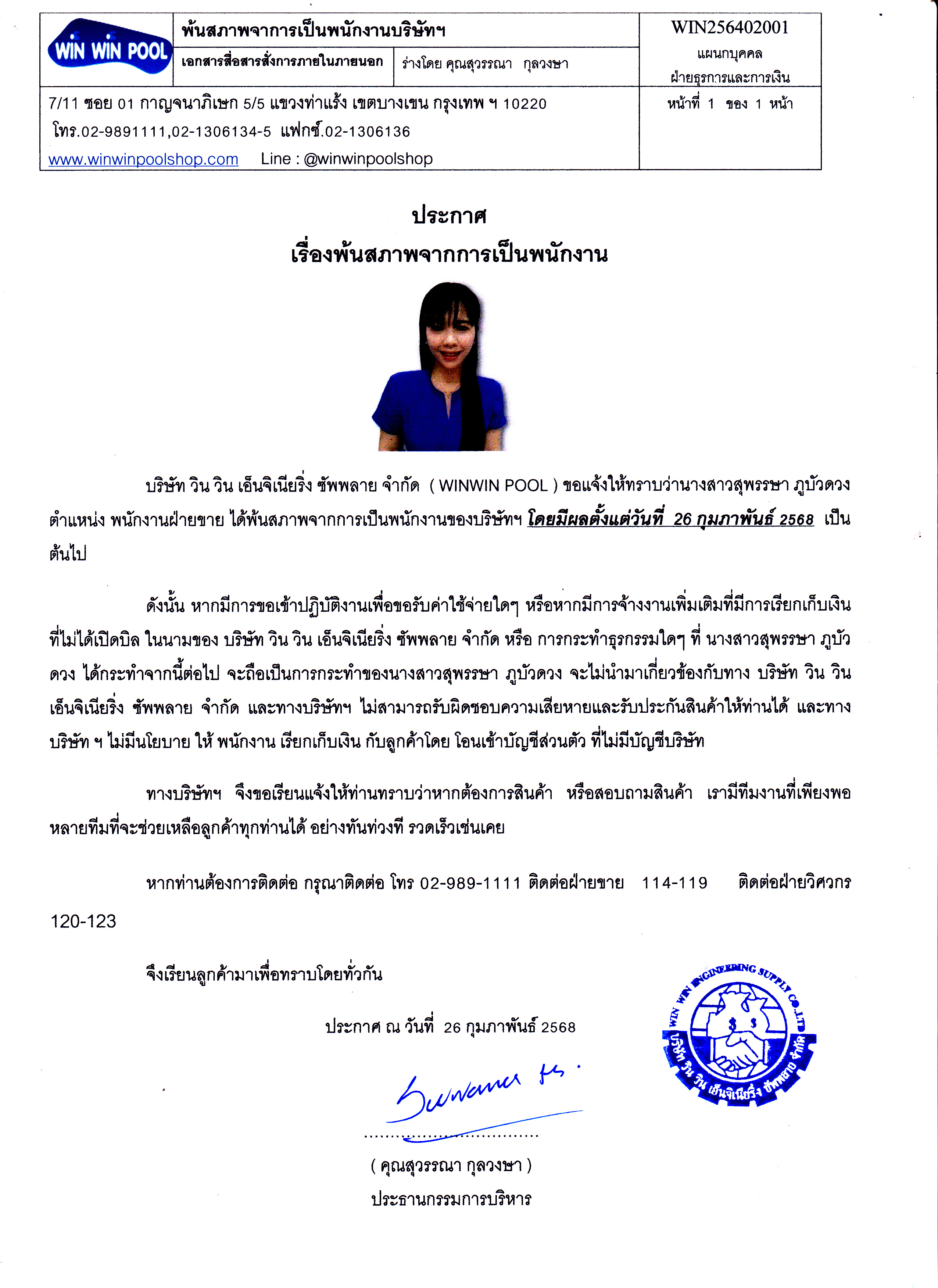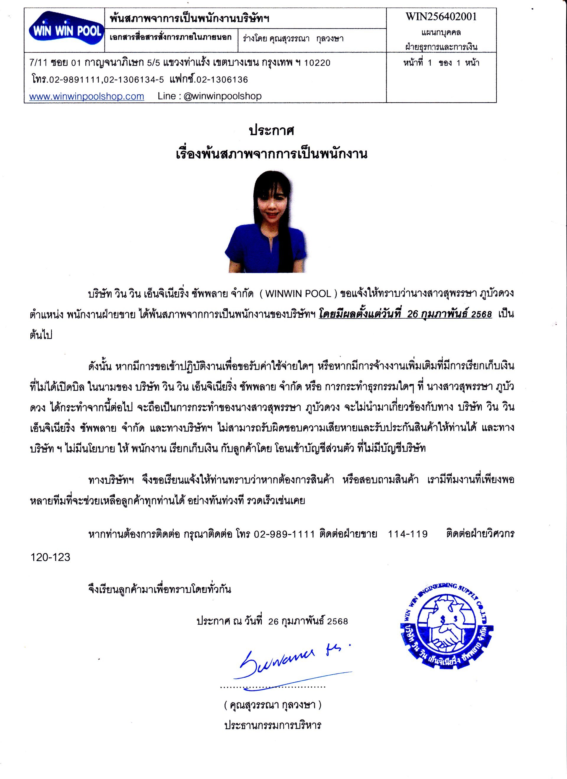เรื่อง พ้นสภาพการเป็นพนักงาน นางสาวสุพรรษา ภูบัวดวง ตำแหน่ง พนักงานฝ่ายขาย