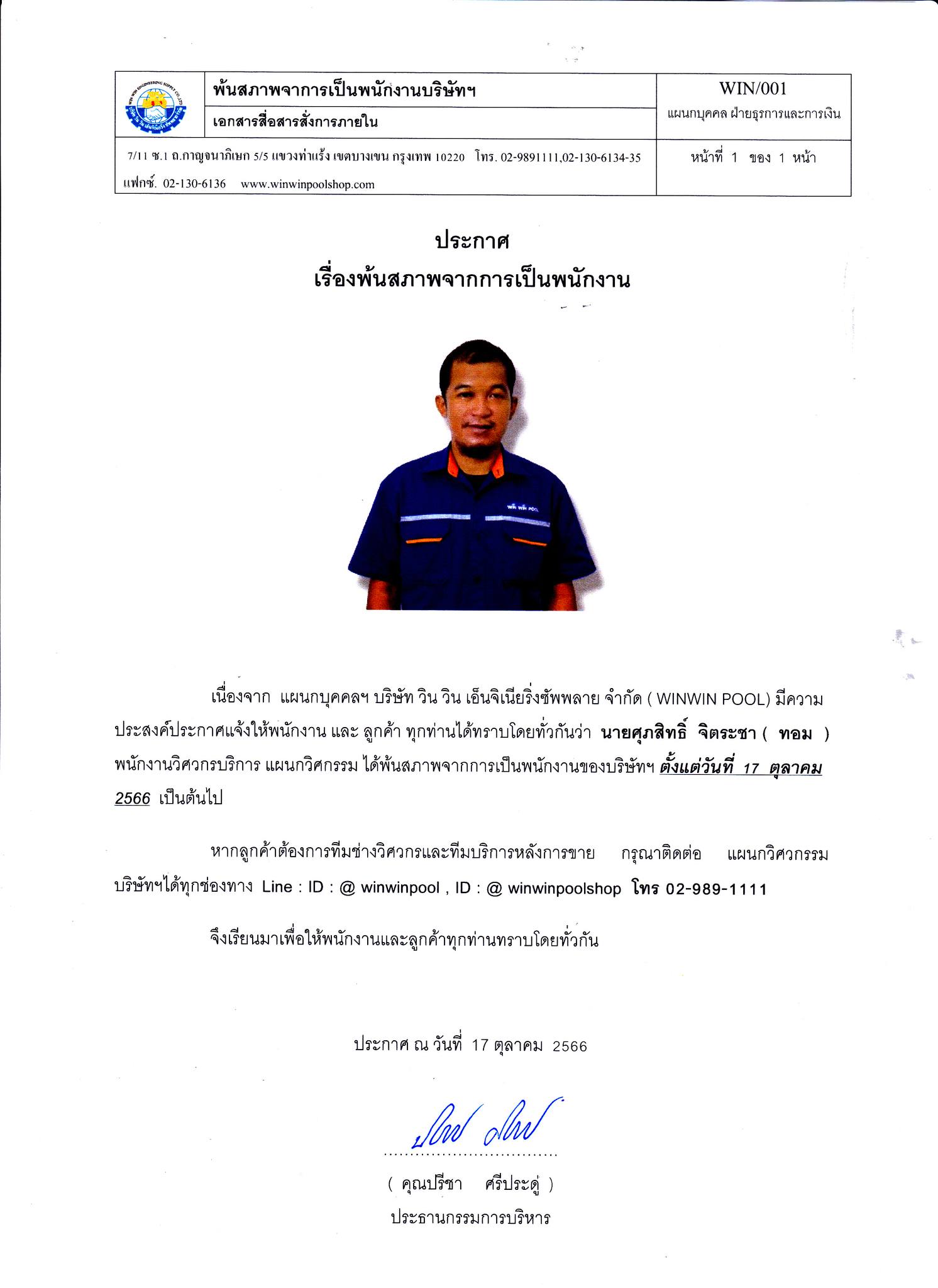 แผนกบุคคล บริษัท วินวิน เอ็นจิเนียริ่ง ซัพพลาย จำกัด มีความประสงค์ที่จะแจ้ง พนักงาน และลูกค้าทุกท่าน ได้ทราบโดยทั่วกันว่า นายศุภสิทธิ์ จิตระชา (ทอม) พนักงานตำแหน่ง วิศวกรบริการ แผนกวิศวกรรม ได้พ้นสภาพการจากการเป็นพนักงานของบริษัทฯ