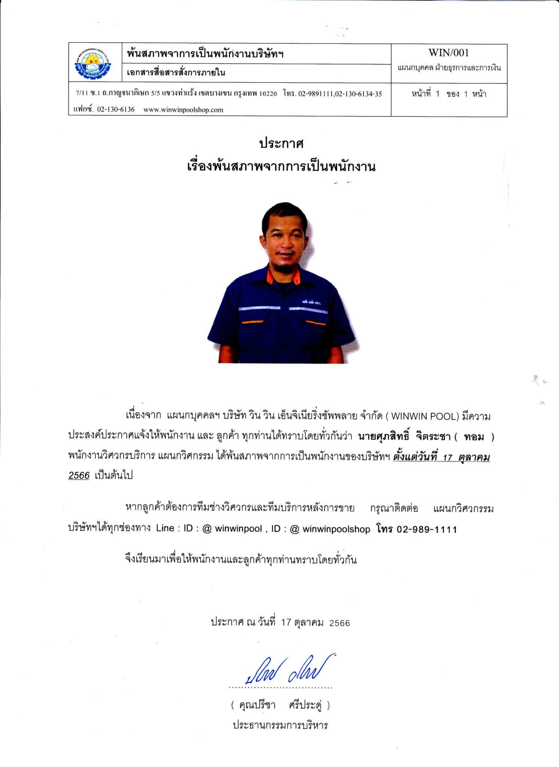 เรื่อง พ้นสภาพการเป็นพนักงาน นายศุภสิทธิ์ จิตระชา (ทอม) พนักงานตำแหน่ง วิศวกรบริการ แผนกวิศวกรรม