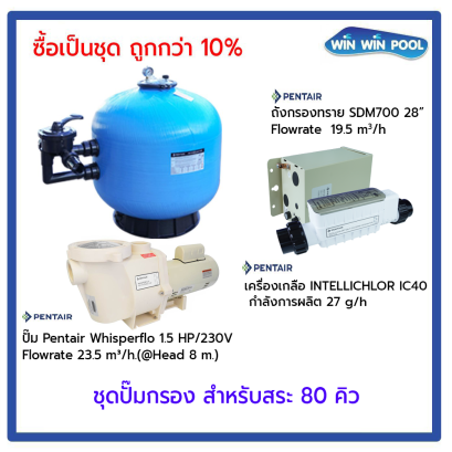 ประกอบด้วย 1.ถังกรองทราย Peintair SDM700 Sand Filter S700 28" 2 ปั๊ม Whisperflo 1.5 HP Pentair Flowrate 23.5 m³/h.(@Head 8 m.) 3.เครื่องผลิตคลอรีนเกลือ Pentair INTELLICHLOR IC40 กำลังการผลิต 27 g/h
