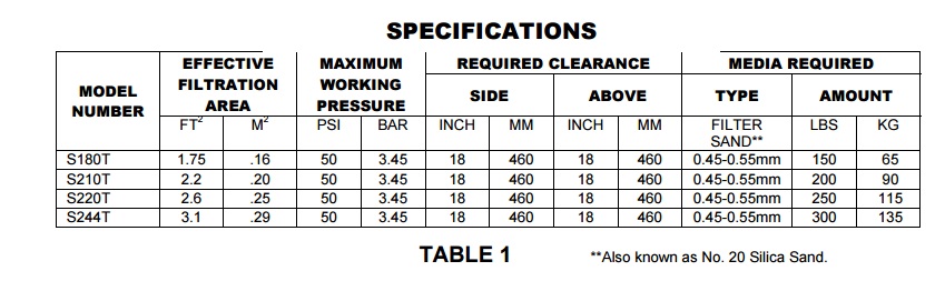 Flowrate 10 m³/Hr. Filter Area: 2.20 ft² Dimemsions Width x Height: 52.1 x 96.5 cm ใช้ทราย(Sand) 91 kg. น้ำหนัก(Weight) 16.78 kg.