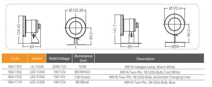 LED F20 1W/12V. AC  for fountain Pool 80 Lux color  cool white (Update 01/02/2025)