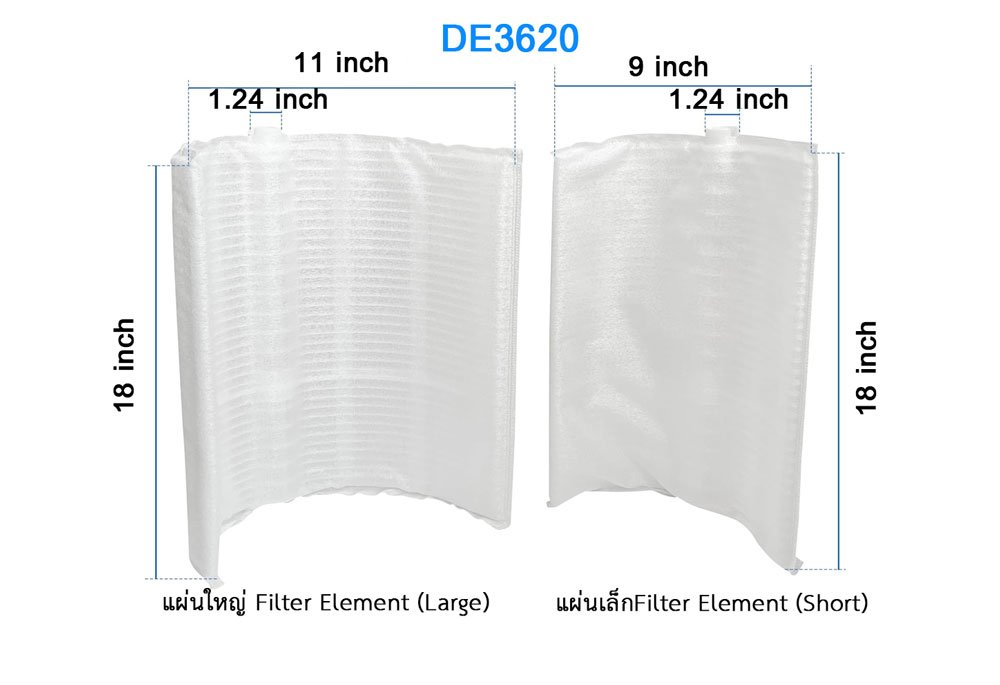 ความสูง 18"(45. 72 cm) แผ่นใหญ่กว้าง 11" ( 27.94 cm.) แผ่นเล็กกว้าง 9" ( 22.86 cm) สำหรับถังกรองผ้ารุ่น DE3620 ใช้แผ่นผ้าแผ่นใหญ่ 7 แผ่น แผ่นเล็ก(DE3600DS) 1 แผ่น (Update 24/02/2024)