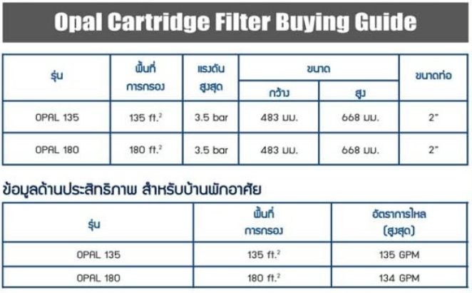 | รุ่น | พื้นที่การกรอง | แรงดันสูงสุด | ขนาดท่อ | อัตราการไหล [บ้านพักอาศัย] |