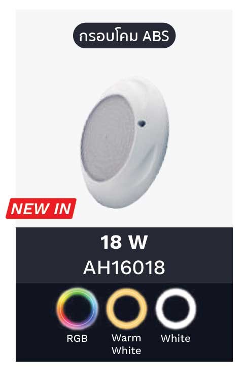 ไฟใต้น้ำ Underwater Light ชนิด LED สำหรับติดตั้งภายในสระว่ายน้ำโดยเฉพาะ รุ่น AH16018 ขนาด 18 Watt สินค้านำเข้าจากประเทศจีนภายใต้ แบรนด์ JESTA ไฟสระว่ายน้ำ LED รุ่นนี้ ใช้การติดตั้งแบบแปะหรือแขวนเข้ากับผนังสระได้ง่ายและสะดวก มีให้เลือกด้วยกัน 3 แบบ ได้แก่ แบบแสงสีขาว แสงวอร์ม และแบบที่สามารถเปลี่ยนสีได้