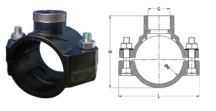 ซึ่งแคล้มป์รัดท่อแยกนั้นผลิตจาก POLYPROPYLENE พร้อมกับมีปะเก็นยางป้องกันการรั่วซึมผลิตจากยาง EPDM ซึ่งแคล้มป์รัดท่อแยกชนิดนี้ถูกออกแบบมาให้ใช้งานง่าย การใช้งานมีลักษณะเป็นแบบฝาประกับประกบกันเพื่อรัดท่อ HDPE หรือ PVC เพื่อแยกออกมาเป็นเกลียวใน ด้านหนึ่งของฝาประกับจะเป็นบานพับ (HIGE) และอีกด้านหนึ่งเป็นด้านที่เป็นจุดล็อคโดยการใช้สลักเกลียวเพียง 2 ตัว เป็นตัวยึดเข้าหากัน