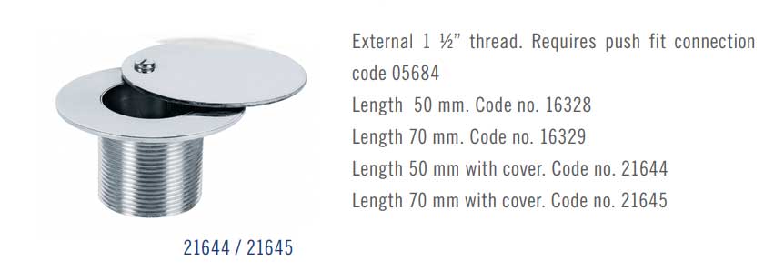 11/2" external thread, lenght 50mm. Manufactured in AISI-316L stainless steel. Push-fit connection 05684 required.