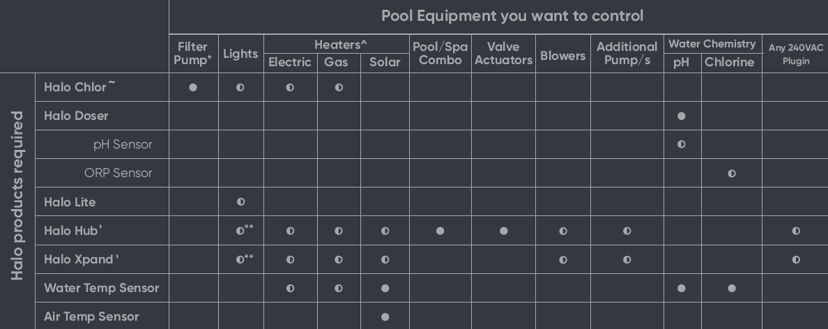 - A full circle denotes the Halo product is required for equipment to be controlled