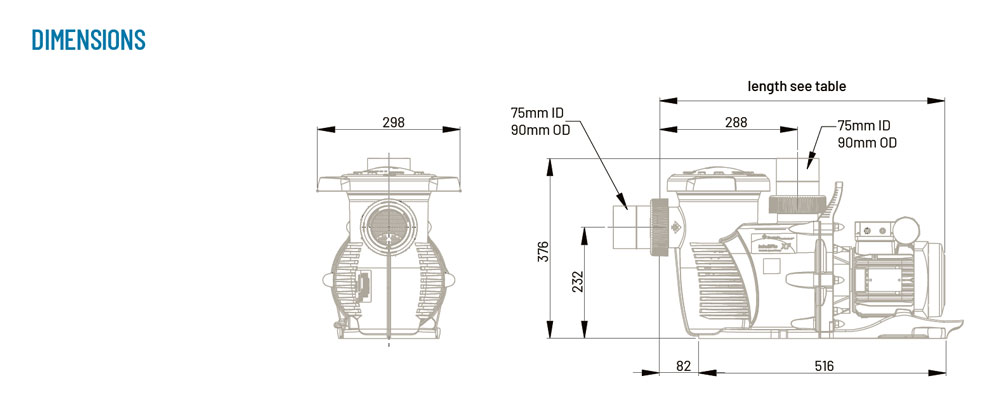 ท่อน้ำเข้าออก (In/Outlet ): 90 mm threaded, ø Unions 75 mm or 90 mm