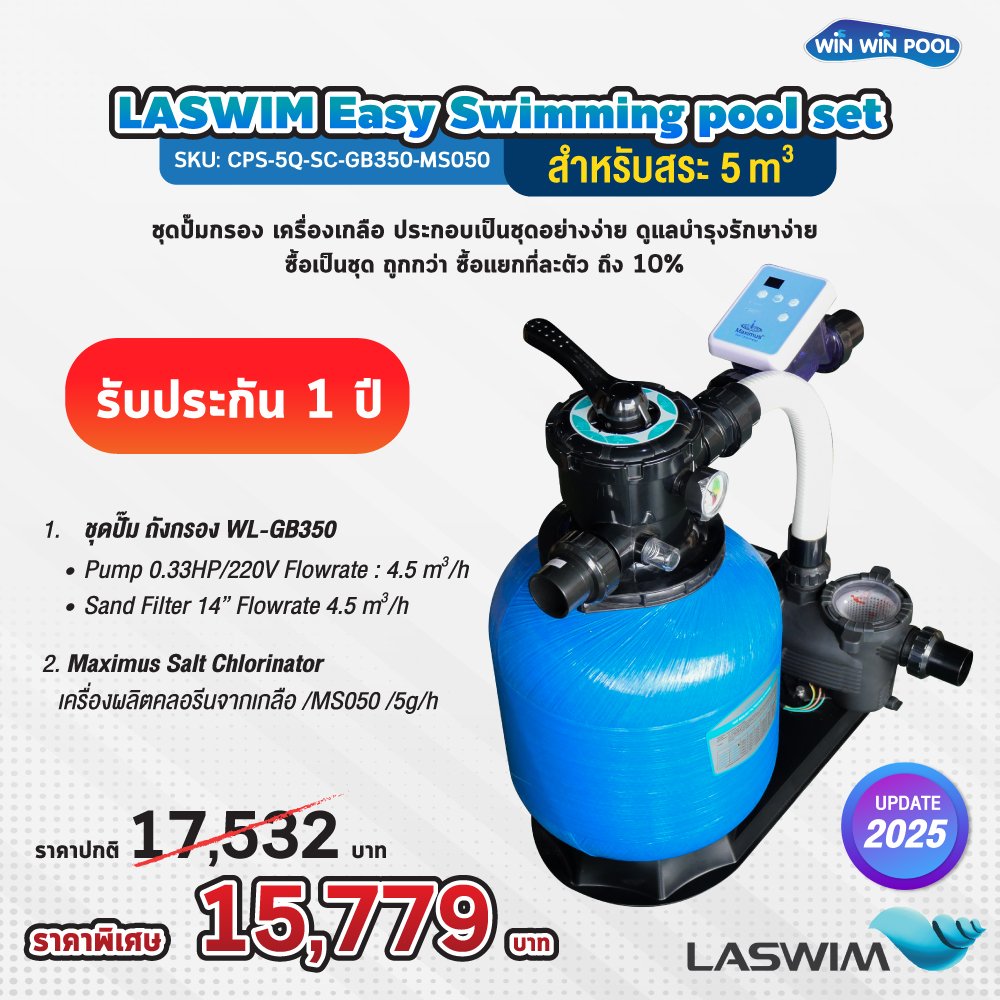 ประกอบด้วย 1. WL-GB350 ชุดปั๊ม ถังกรอง Pump 0.33HP/220V Flowrate :4.5m3/h Sand Filter 14” Flowrate 4.5m3/h 2.Maximus Salt Chlorinator เครื่องผลิตคลอรีนจากเกลือ /MS050 /5g/h (update 28/02/2024)