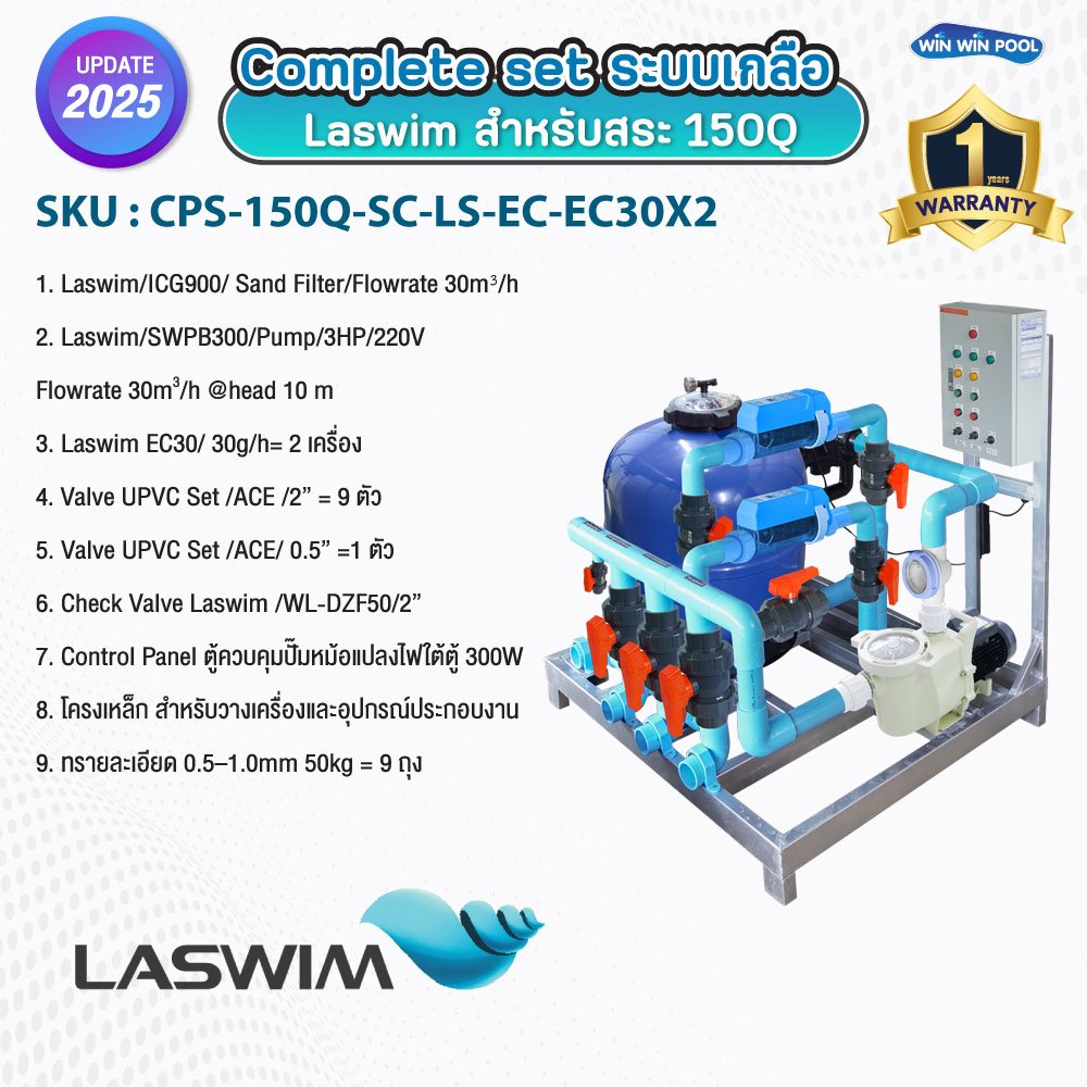 1. Laswim/ICG900/ Sand Filter/Flowrate 30m³/h 2. Laswim/SWPB300/Pump/3HP/220V Flowrate 30m³/h @head 10 m 3. Laswim EC30/ 30g/h=2 เครื่อง 4. Valve UPVC Set /ACE /2” =9 ตัว 5. Valve UPVC Set /ACE/ 0.5” =1 ตัว 6. Check Valve Laswim /WL-DZF50/2” 7. Control Panel ตู้ควบคุมปั๊ม + หม้อแปลงไฟใต้ตู้ 300W 8. โครงเหล็ก สำหรับวางเครื่องและอุปกรณ์ประกอบงาน 9. ทรายละเอียด 0.5–1.0mm 50kg = 9ถุง (update 1/10/2025)