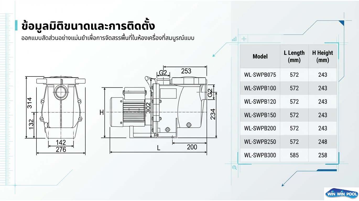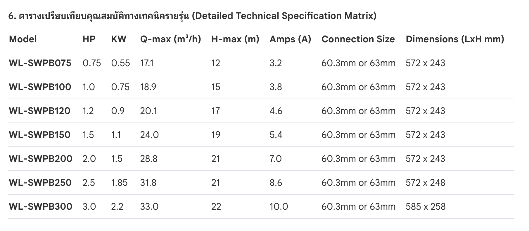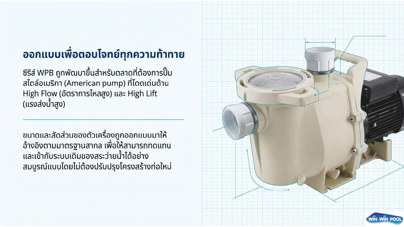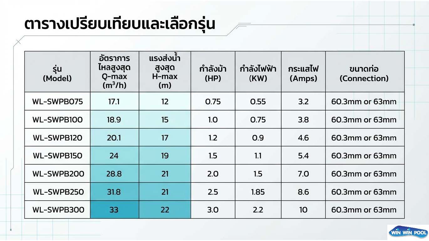 การเลือกใช้ตามขนาดโครงการ: สำหรับสระว่ายน้ำเชิงพาณิชย์หรือระบบถ่ายเทน้ำที่ต้องการอัตราการไหลสูง (High Turnover) รุ่น WL-SWPB300 คือตัวเลือกที่เหมาะสมที่สุดในการทำหน้าที่เป็นปั๊มหลัก