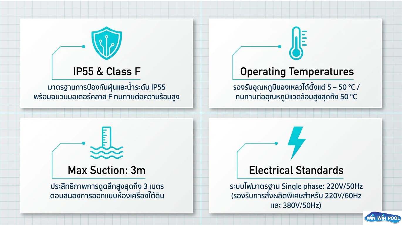 Max Suction (3 เมตร): ให้ความยืดหยุ่นสูงในการวางผังระบบท่อในกรณีที่ระดับน้ำอยู่ต่ำกว่าตัวปั๊ม