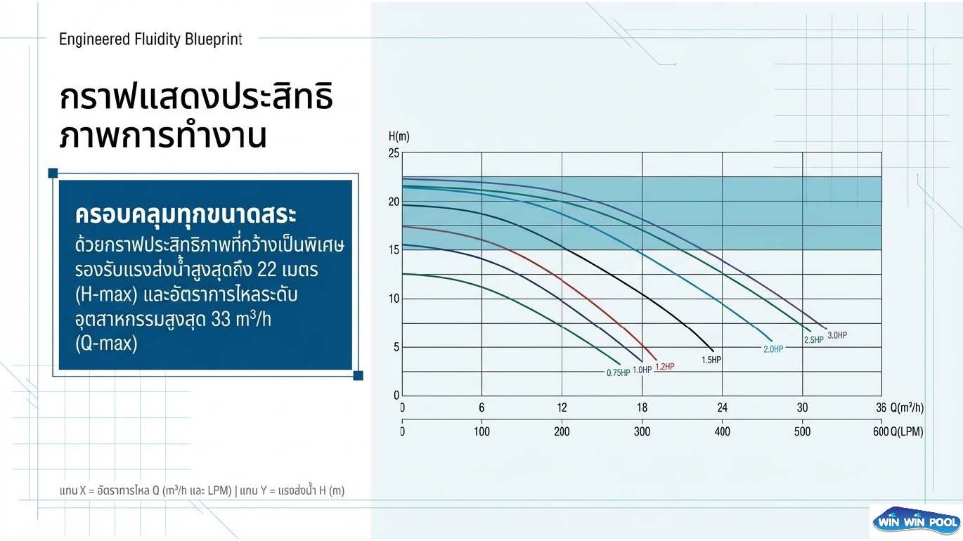 การเลือก Duty Point (จุดทำงานจริง): เพื่อประสิทธิภาพสูงสุด (Optimal Efficiency) ควรเลือกช่วงกลางของกราฟ เช่น รุ่น 3.0HP จะทำงานได้อย่างยอดเยี่ยมที่ 18 m³/h ที่แรงดัน (Head) 15 เมตร ซึ่งเป็นจุดที่มวลน้ำและแรงดันมีความสมดุล