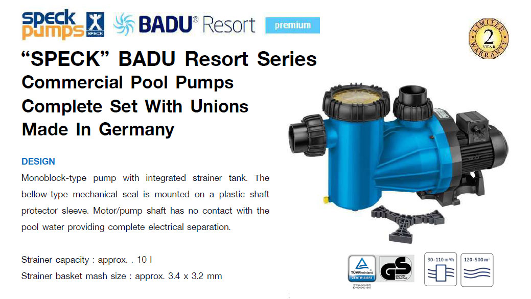 The BADU Resort covers fields of application which would otherwise be served by expensive, heavy duty bronze and cast-iron pumps. The BADU Resort’s areas of expertise are wellness spas with large pools or attractions such as splash showers and waterfalls, hotel swimming pools and extraordinary private swimming pools. Thanks to the high quality reinforced fibreglass plastic version, investment costs are dramatically reduced without affecting the superior performance and durability.