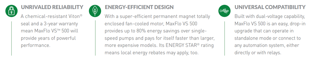 MaxFlo VS™ 500 variable-speed pump built with dual-voltage capability, is the newest addition to the MaxFlo pump family that provides up to 80% energy savings over single-speed pumps. MaxFlo VS™ 500 is an easy drop-in upgrade that will provide years of powerful performance.