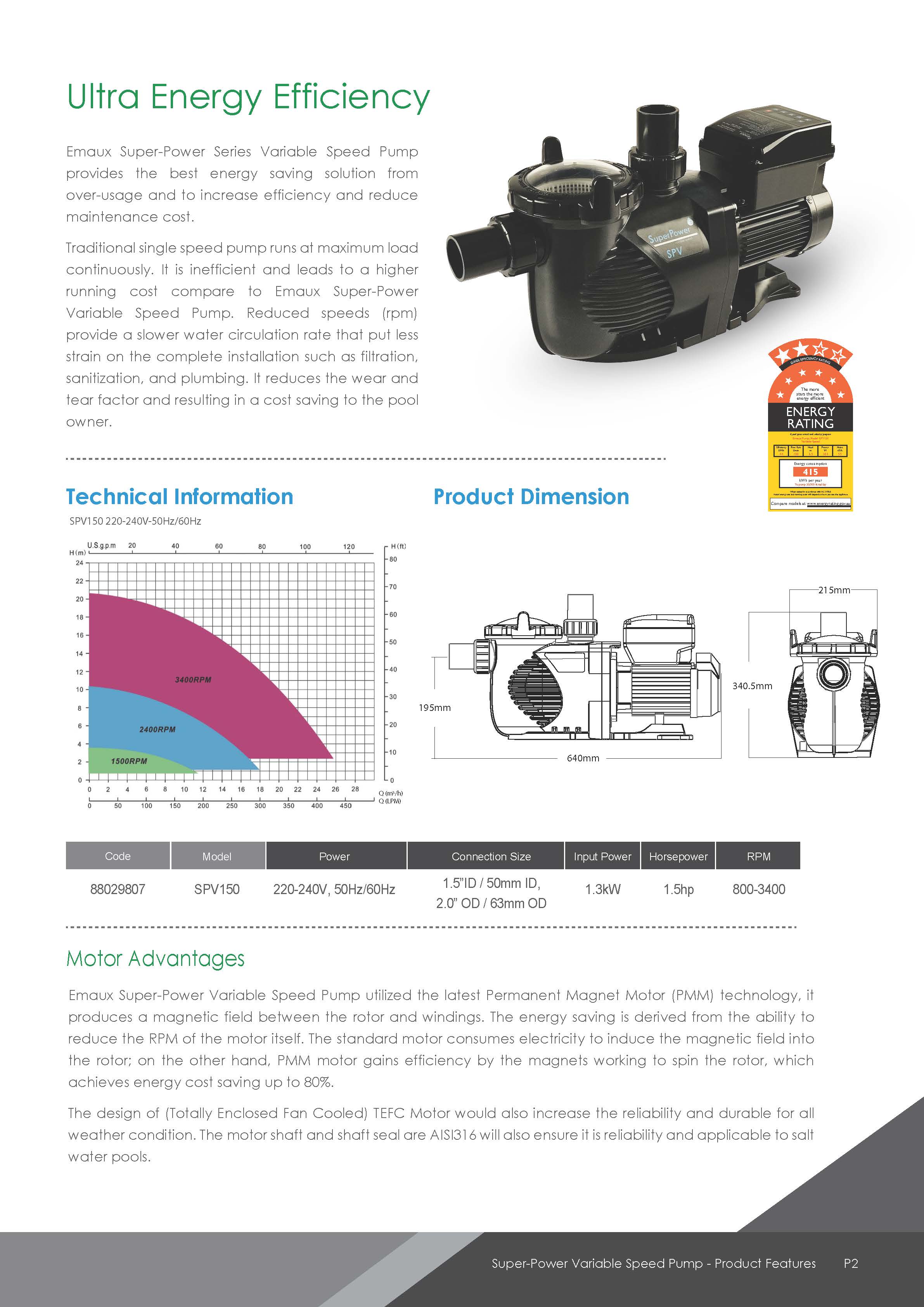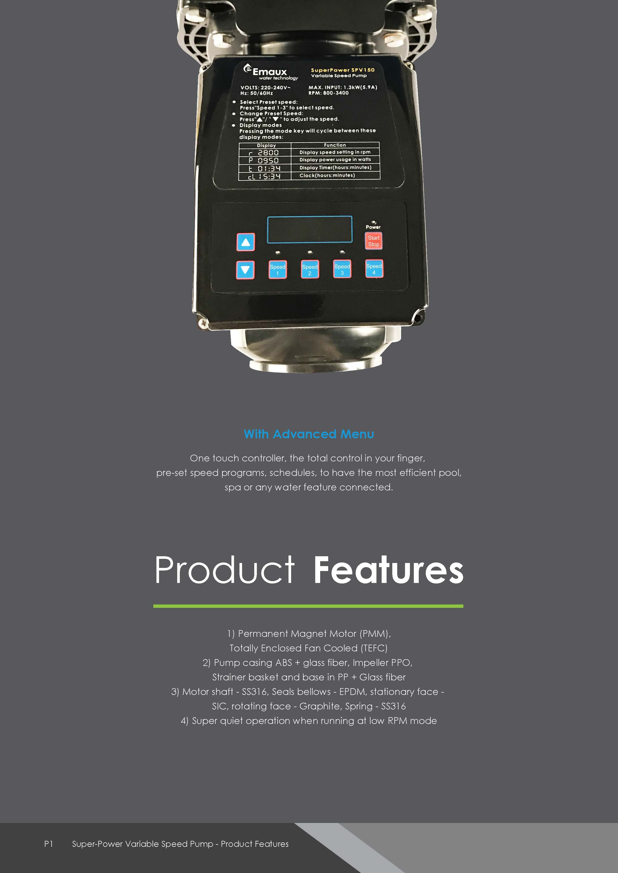 Emaux Super-Power Variable Speed Pump reduces the energy use of your pool, spa, and water features. Thanks to its higher efficiency, it eliminates over-usage and reduces equipment maintenance costs.