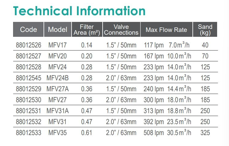 MFV27A Top Mount Dimeter Ø : 675 mm. (27") วาล์ว(Valve) 1.5" Max Flowrate 14.4 m³/Hr. Filter Area: 0.36 m² ความสูง(Height) 108.1 cm. ความกว้าง(Width) 27" (67.5 cm) ใช้ทราย (Sand) 185 kg. (update 01/02/2025)