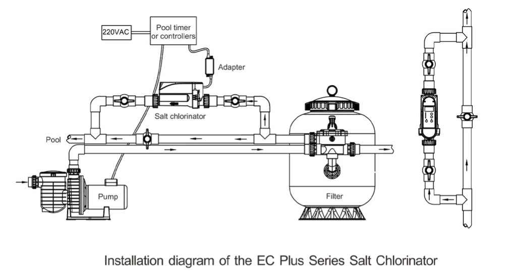 Simply put a corresponding amount of salt into the pool,the EC Plus series salt chlorinator will produce chlorine needed for disinfection automatically.
