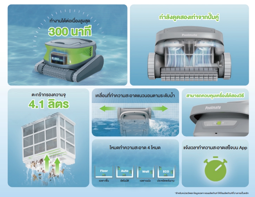 | ครอบคุมพื้นที่ความสะอาด/Cleaning Coverage | พื้น / ผนัง / ผนังท๊๋ระดับผิวน้ำ Floor / Walls / Waterline | ||