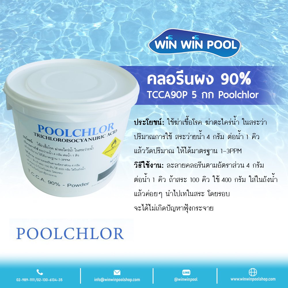 T.C.C.A 90% Chlorine Powder Packing 5 kg. , ใส่ในสระว่ายน้ำ 4 กรัม ต่อน้ำ 1 คิว แล้ววัดปริมาณ ให้ได้มาตรฐาน 1-3PPM (Update 17/03/2025)