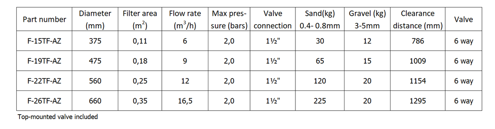 MaxFlowRate: 9.0 m³/h Dimeter : 475 mm. (19") Valve Connections: 1.5inch / 50mm. Filter Area: 0.18 m² Media Volume: - sand(0.4-0.8mm) 65 Kg., - Graval(3-5mm) 15 kg. Max Pressure : 2 Bars. สูง (Height): 924 mm. กว้าง (Weight): Ø 400 mm.(update 27-09-22)