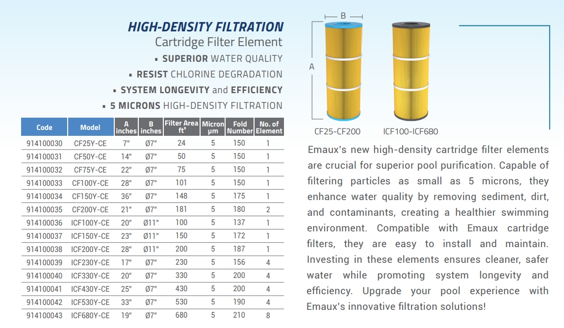 ไส้กรองคาร์ทริดจ์ Emaux เป็นโซลูชันการกรองขั้นสูงที่ออกแบบมาเพื่อเพิ่มคุณภาพน้ำในสระว่ายน้ำและสร้างสภาพแวดล้อมการว่ายน้ำที่สะอาดและดีต่อสุขภาพยิ่งขึ้น ผลิตจากวัสดุความหนาแน่นสูงและมีให้เลือกหลายขนาดไมครอนและวัสดุ ไส้กรองเหล่านี้สามารถกรองอนุภาคขนาดเล็กถึง 5 ไมครอนได้อย่างมีประสิทธิภาพ ขจัดตะกอน สิ่งสกปรก และสารปนเปื้อนออกจากน้ำได้อย่างหมดจด