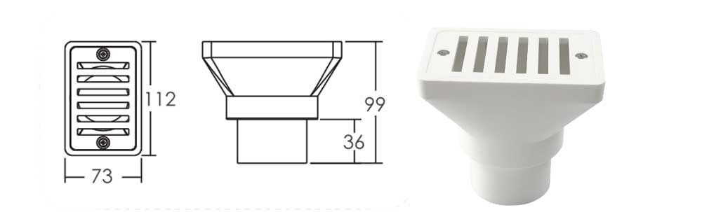 กัตเตอร์เดรนสำหรับระบบรางน้ำ (overflow) ของสระว่ายน้ำ รุ่น EM2819(A2) ผลิตจาก ABS Grade A ทน UV สีขาว ขนาดต่อท่อ 1.5" เหมาะสำหรับสระคอนกรีต ไฟเบอร์กลาส และไวนิล