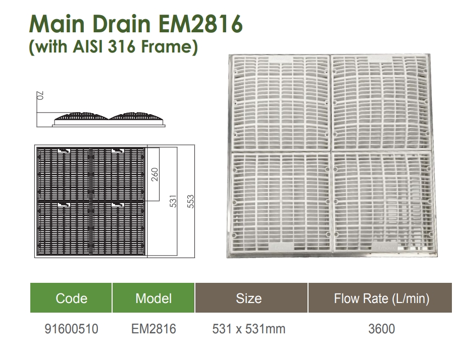 สะดือสระน้ำเซฟตี้สี่เหลี่ยม 12×12 นิ้ว (4 ชิ้น) VGB Anti Vortex พร้อมโครงสแตนเลส 316 EMAUX (Update 14/02/2026)