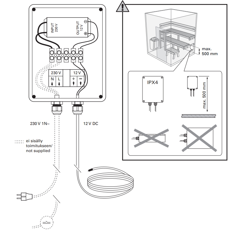 The LED strip is easily installed in the backrests or in the front part of the upper or lower berth. Due to the high heat, the LED strip cannot be installed at a height higher than 1.60 m. Complete with 3m long heat-resistant silicone cable and 12V transformer with hermetic mounting box, which can be installed in the sauna at a height of no more than 50cm. The LED strip can be cut to various lengths every 5 cm.