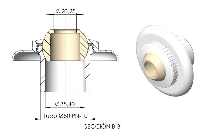 Multiflow return inlet to be glued to a Ø50 mm PN10 pipe in concrete pools and with a water outlet through a Ø20 mm hole.