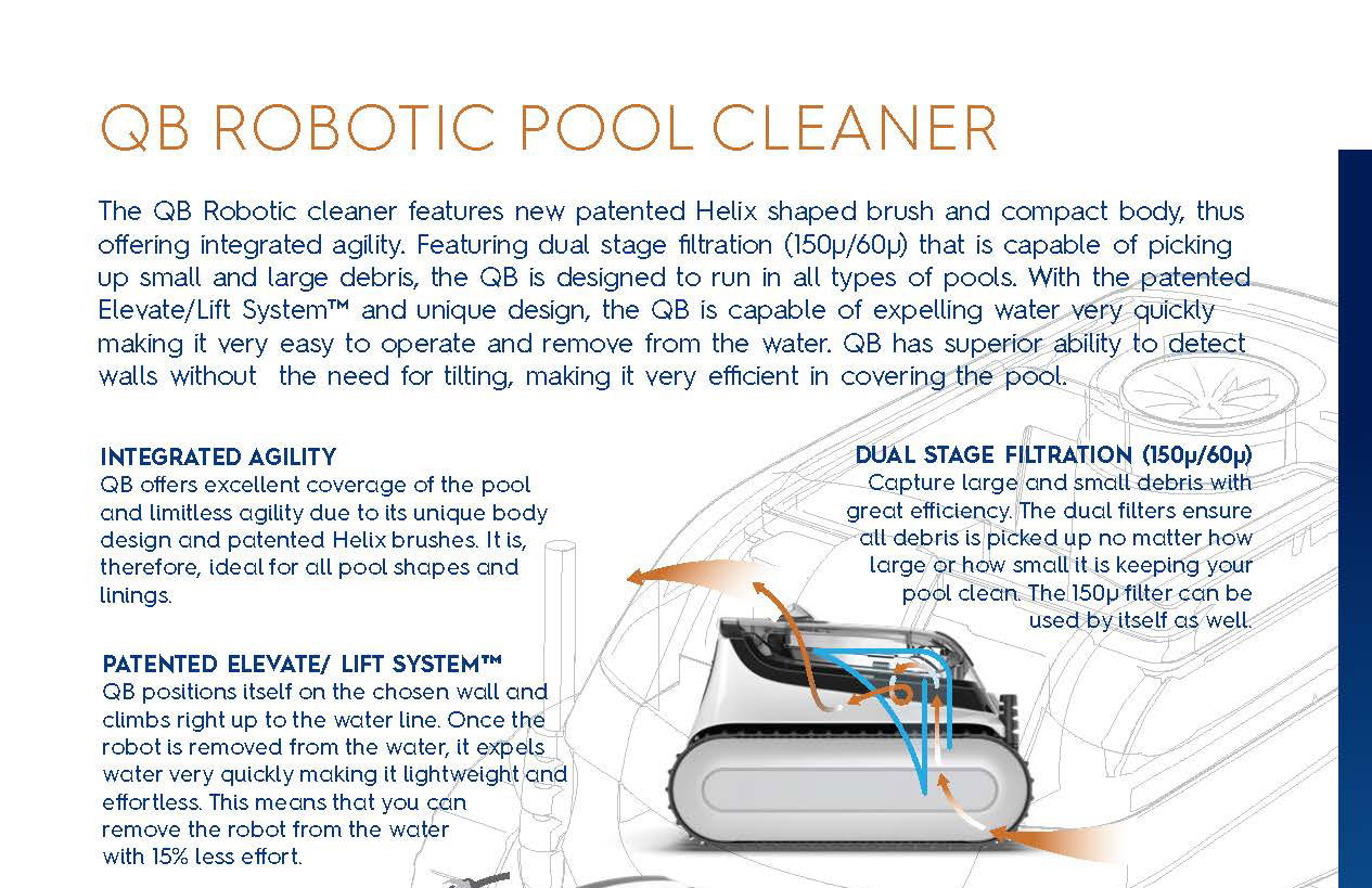 มีสินค้าใน Shopee     QB600 มีแปรงรูปทรง Helix ที่ได้รับการจดสิทธิบัตรใหม่และตัวเครื่องที่กะทัดรัด จึงให้ความคล่องตัวในตัว คุณสมบัติการกรองแบบสองขั้นตอน (150μ/60μ) ที่สามารถกรองเศษขยะขนาดเล็กและขนาดใหญ่ QB600 ได้รับการออกแบบให้ทำงานในสระทุกประเภท ด้วยระบบ Elevate/Lift System™ ที่ได้รับการจดสิทธิบัตรและการออกแบบที่เป็นเอกลักษณ์ QB600 สามารถไล่น้ำออกได้อย่างรวดเร็ว ทำให้ง่ายต่อการใช้งานและนำออกจากน้ำ QB600 มีความสามารถที่เหนือกว่าในการตรวจจับผนังโดยไม่ต้องเอียง ทำให้ครอบคลุมสระว่ายน้ำได้อย่างมีประสิทธิภาพมาก