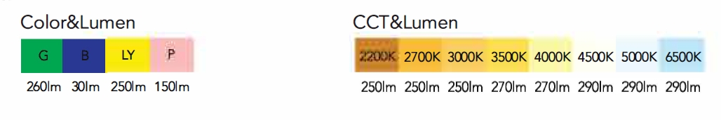 • 2200K: 250lm, 2700K: 250lm, 3000K: 250lm, 3500K: 270lm, 4000K: 270lm, 4500K: 290lm, 5000K: 290lm, 6500K: 290lm